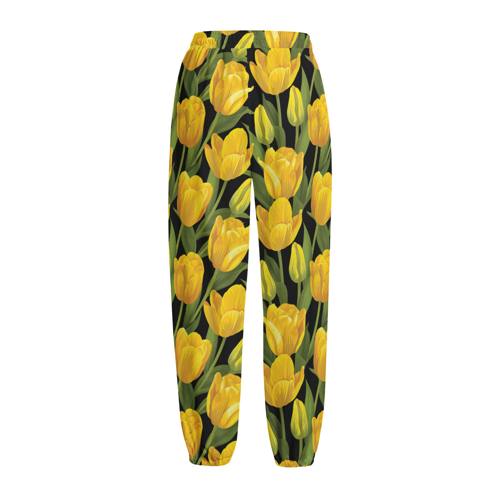 Yellow Tulip Pattern Print Fleece Lined Knit Pants